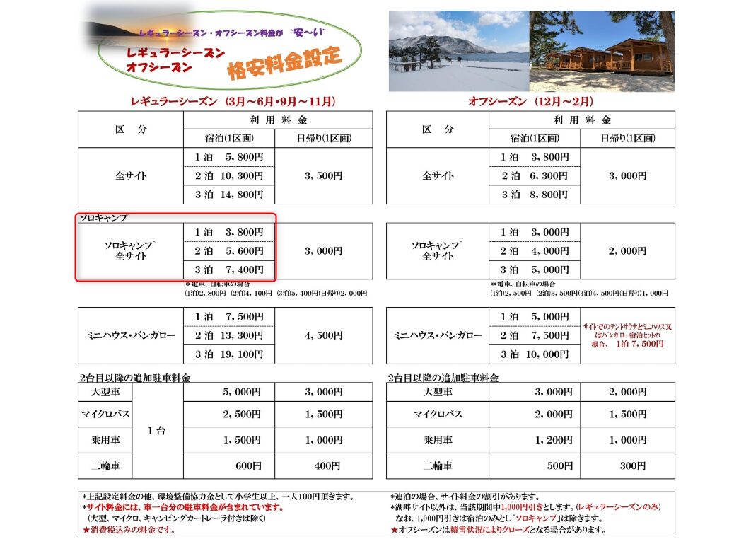 ただ、湖畔サイトAのソロ料金は、4000円のようです!※なっぷから予約で確認できました。
