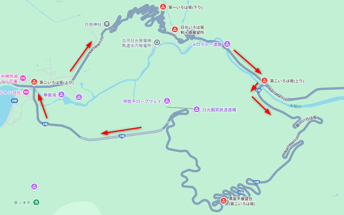 宇都宮方面から中禅寺湖方面に向かう場合は、第二いろは坂(上り)で行き、帰る場合は、第一いろは坂(下り)で行きます。