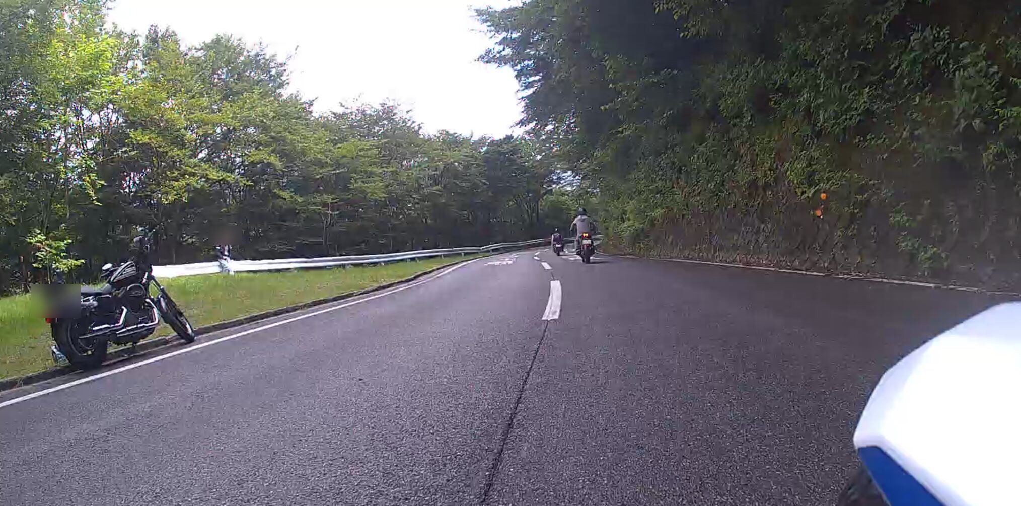 自分のバイクも前輪が滑って恐怖を感じました。左側道を見ると、1台のバイクがレッカー待ちをしていました。